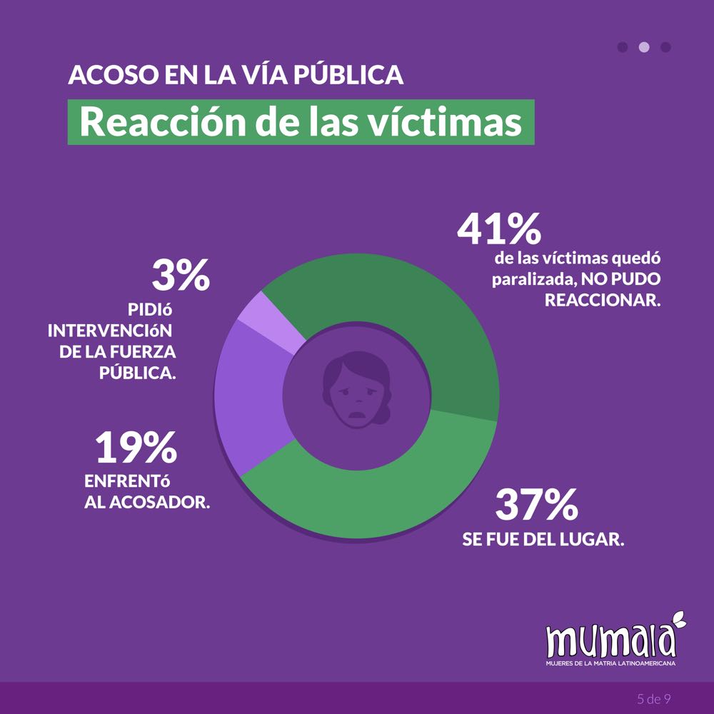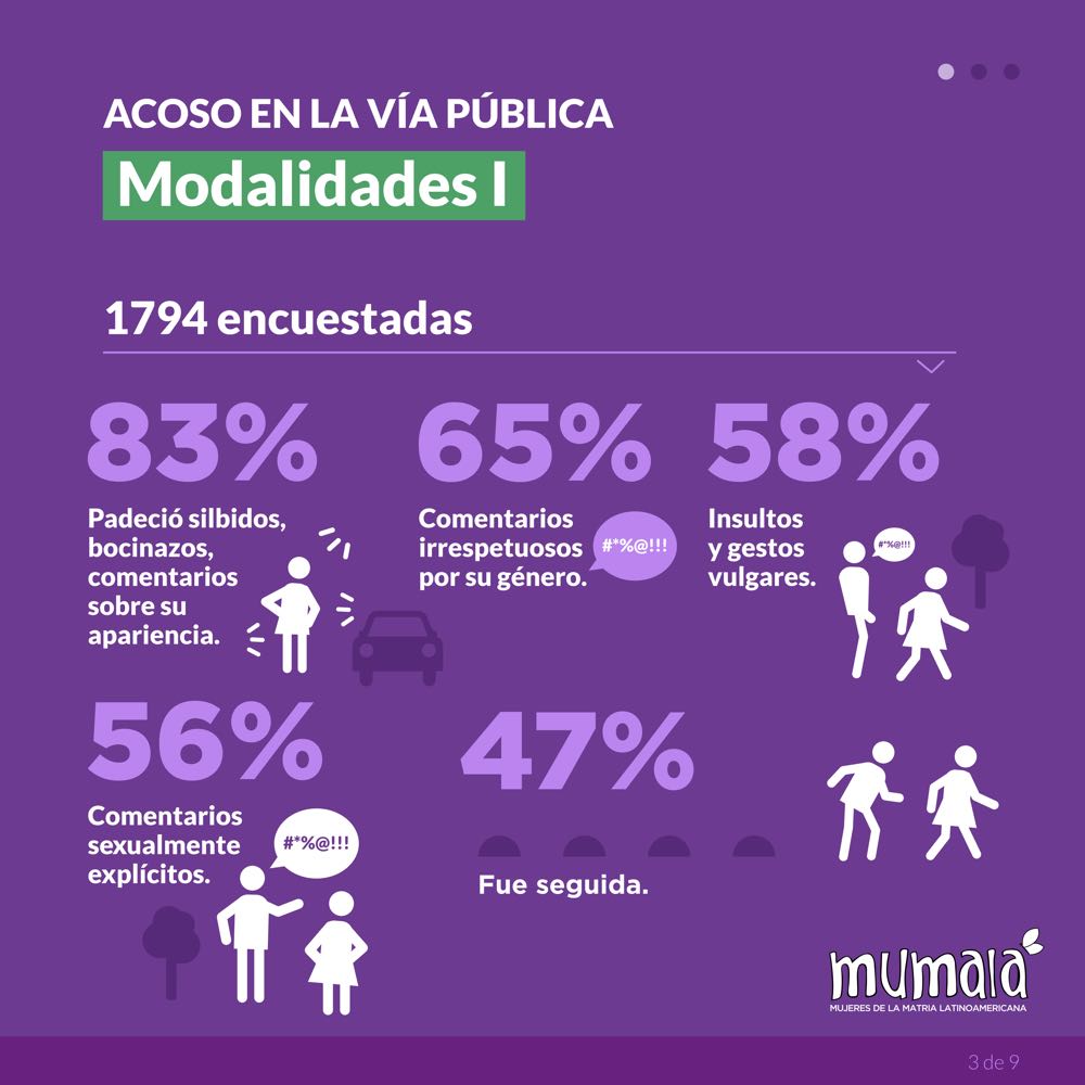 En una encuesta de 2022 realizada por el Observatorio Mumalá, El 94% de las personas mencionó haber sufrido alguna forma de acoso sexual en la vía pública. Según datos del Observatorio de las Violencias y Desigualdades por Razones de Género (OVyDRG) del ex Ministerio de las Mujeres, Géneros y Diversidad de la Nación, entre el 22% y 25% de las consultas recibidas durante 2022 y 2023 en la Línea 144 refieren a situaciones de acoso sexual callejero. El 25.9 % de las personas tienen entre 25 a 34 años, mientras que el 15.7% tienen entre 15 y 24 años. El 98.3% de las consultas refirieron que el género del agresor es varón.